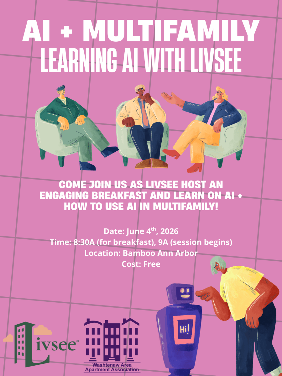 A breakfast and coffee chat about AI; understanding the different models of AI and how to implement its use into multifamily. With speakers coming from Michigan State University and the founder of Livsee. More information to come.